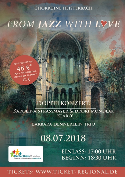 „From Jazz with love“ war das Motto des Benefizkonzertes, welches am 08.07.18 vor der eindrucksvollen Klosterruine Heisterbach stattfand. Eröffnet wurde das Konzert von der Saxofonistin Karolina Strassmeyer mit ihrem Quartett „Klaro“. Hinzu kam der Auftritt des Trios der Barbara Dennerlein, welche selbst eine klassische Hammond B 3-Orgel spielt. Beide Künstlerinnen haben sich einen großen Namen […]